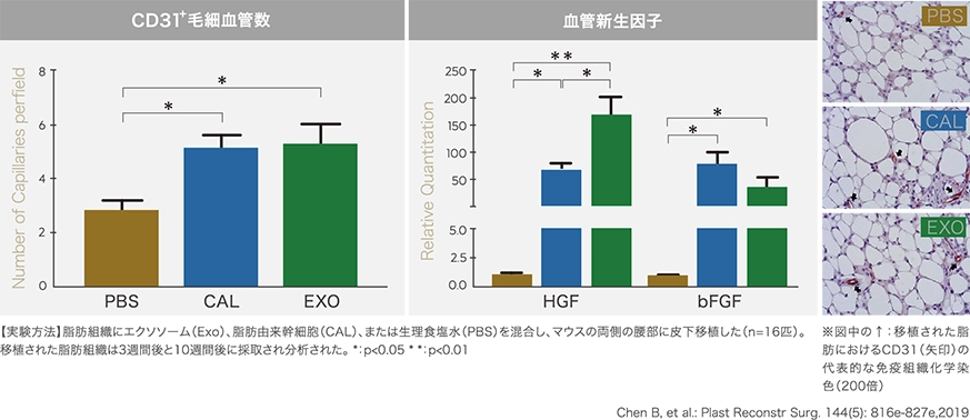 エクソソームの投与後、毛細血管の数は脂肪由来幹細胞と同程度に増加しました。また、血管新生を促す各種因子も有意な増加が認められました。このことから、エクソソームは投与後数週間で組織の血管新生を改善することが示唆されます。