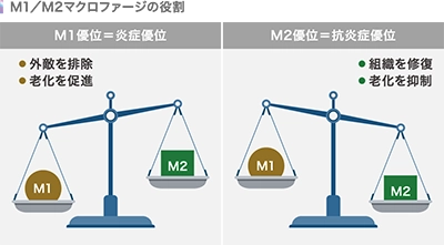 炎症にはM1、M2という2つのマクロファージが関与しています。M1は炎症反応を担い、炎症の元となる細菌や病原体を攻撃・排除する働きがあります。一方、M2には炎症後の組織を修復する働きや、抗炎症作用があります。したがって、老化の進行を抑え、より優れた細胞の活性化を期待するのであれば、M2マクロファージが優位の状態を目指すことが重要になります。
