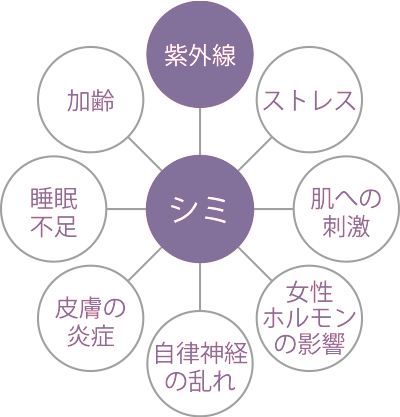 最も影響を受けるのは、紫外線によるものと言われています。他にも、加齢やストレス、睡眠不足、女性ホルモンの影響、肝臓や卵巣の働きの低下、自律神経の乱れ、過剰な刺激、食べ物など、その原因は様々です。また、かぶれやニキビなど皮膚に起きた炎症がシミになるケースもあります。