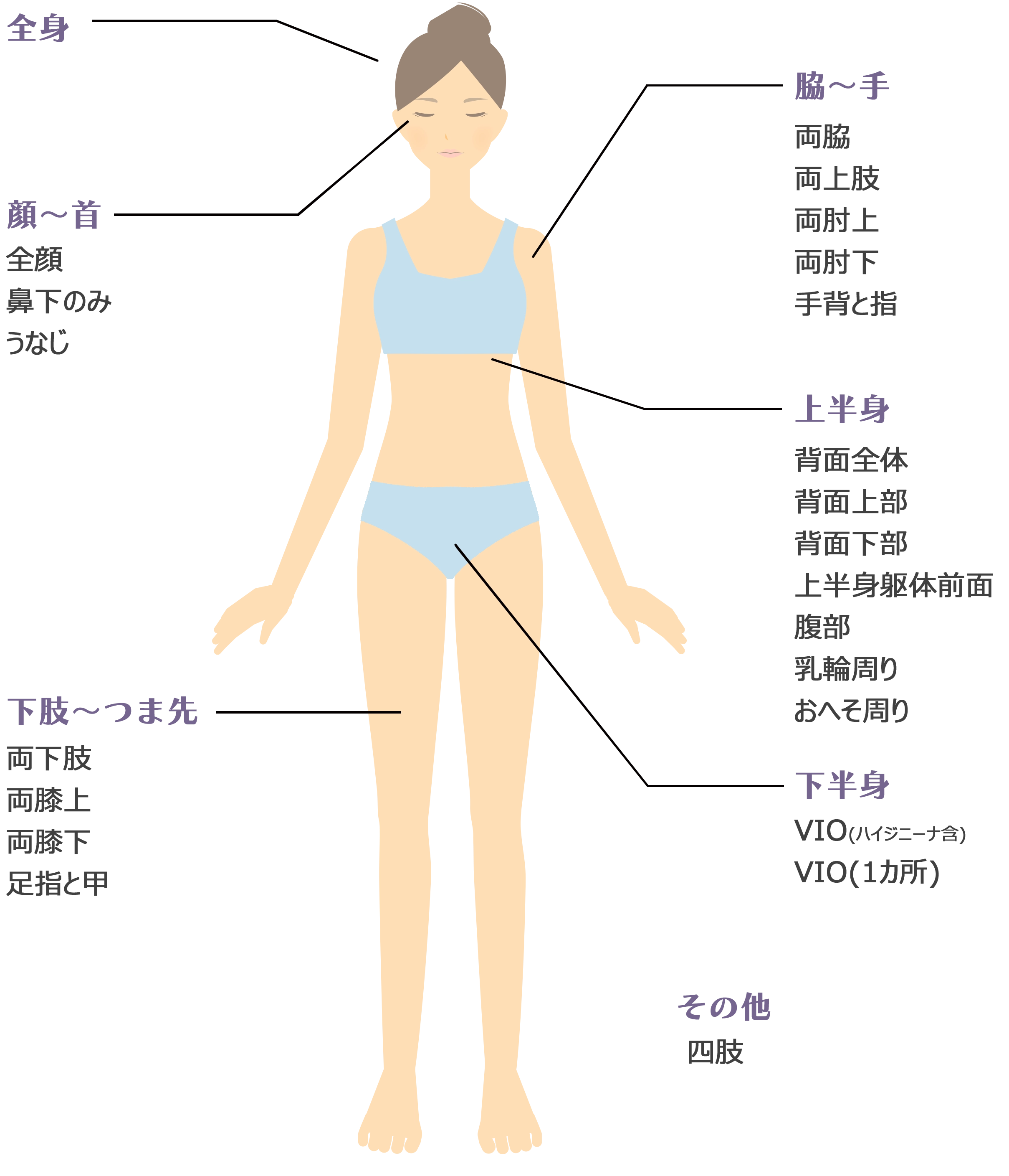 | 背面全体 | 30,800円 | 背面上部 | 16,500円 | 背面下部 | 16,500円 | 上半身躯体前面(鎖骨~バストライン) | 16,500円 | 腹部(バストライン~上前腸骨棘ライン) | 16,500円 | 乳輪周り | 8,800円 | おへそ周り(直径10cm以内) | 8,800円 | VIO(ハイジニーナ含) | 22,000円 | VIO(1ヵ所) | 11,000円 |