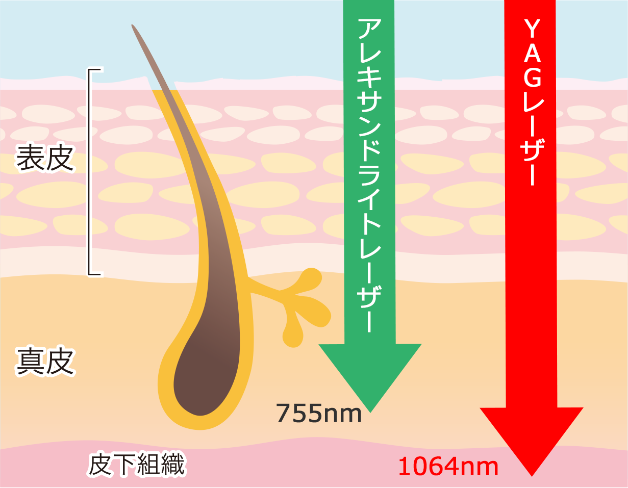 アレキサンドライトレーザーの特長は、メラニン等の色に反応しながらレーザーが照射される性質ですが、YAGレーザーは波長が長いため、根深い毛や日焼けしたお肌にも使用できる特長を持っています。