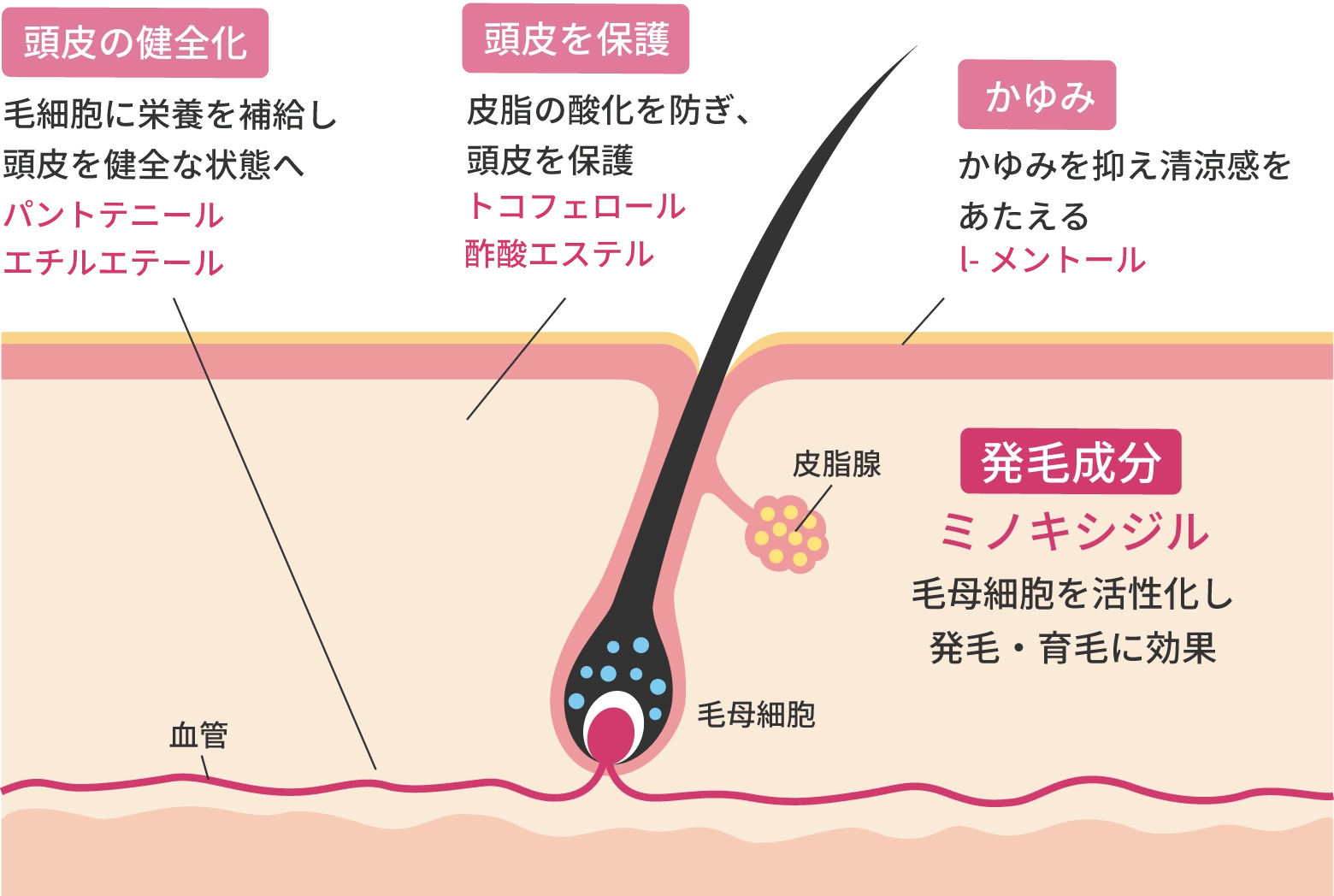 ミノキシジルが持つ血管拡張作用が頭皮の血流を増やすことで、細胞分裂を活発にします。ミノキシジルは毛母細胞に直接働きかけて毛根に栄養成分を行き渡らせ、髪の成長を促進する育毛効果があります。外用薬は主に頭頂部の発毛・育毛に効果的です。