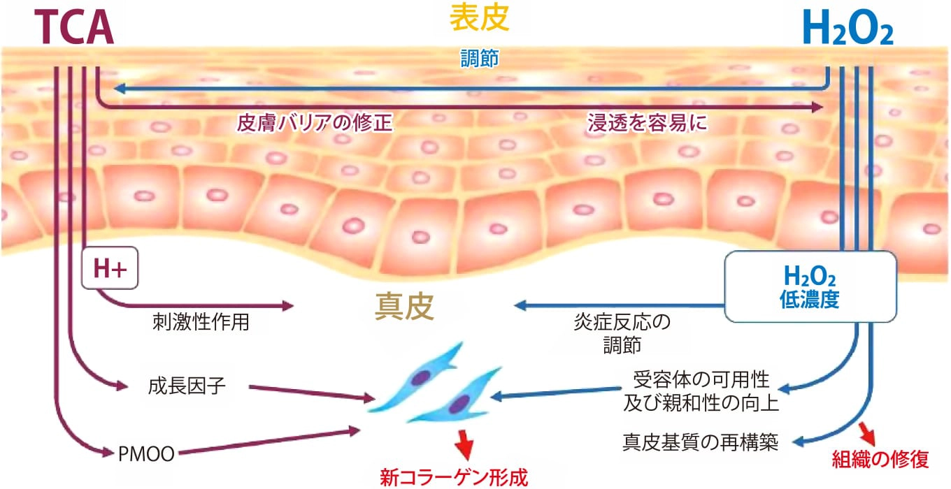 TCAは単体でお肌に用いれば、フロスティング(皮膚の剥離)が生じることもありますが、過酸化水素との厳密な配合によりpHが調整されており、そのリスクがありません。