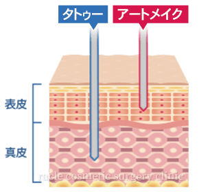 大きな違いは、色素を入れる深さにあります。刺青は皮膚表面から約2mmほどの深い部分に色素を入れるため、一度入れると落ちることがありません。アートメイクは、皮膚からごく浅い部分に色素を入れるため、皮膚の新陳代謝で少しずつ薄くなっていく「メイク」です。